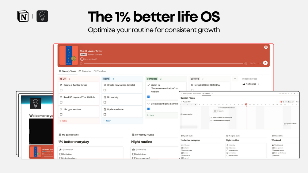 This comprehensive Notion template empowers you to make steady, incremental progress towards your goals and dreams. Rather than focusing on radical life overhauls, the "1% Better Life System" guides you to implement sustainable, 1% improvements to your daily habits and routines.